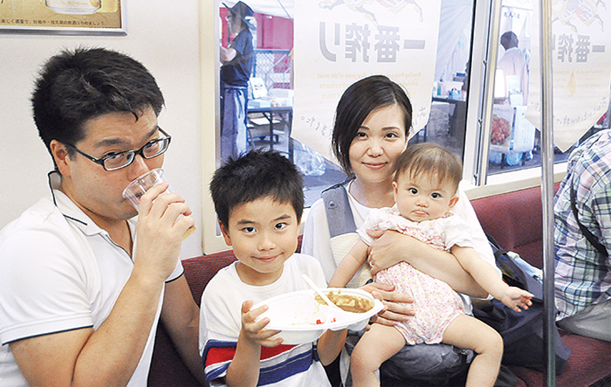 開放された車内はビールを片手に、餃子やまぐろステーキ、海軍カレーなど京急沿線のご当地グルメを楽しむ客で賑わった。