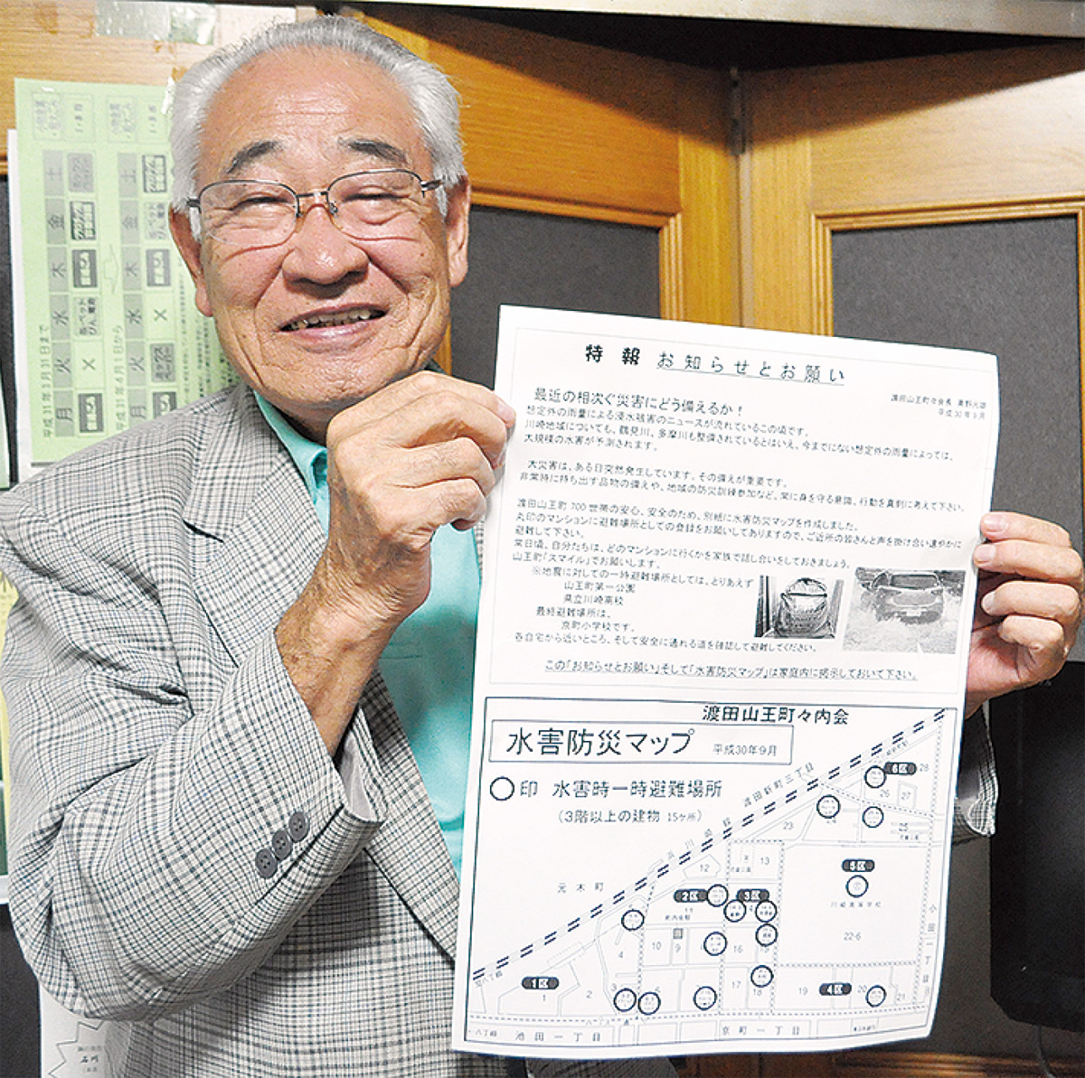 渡田山王町町内会(高野元雄会長)は、今年7月に発生した西日本豪雨を受け、同町内で水害が起きた際の一時避難場所を示した防災マップを9月8日に完成させた。