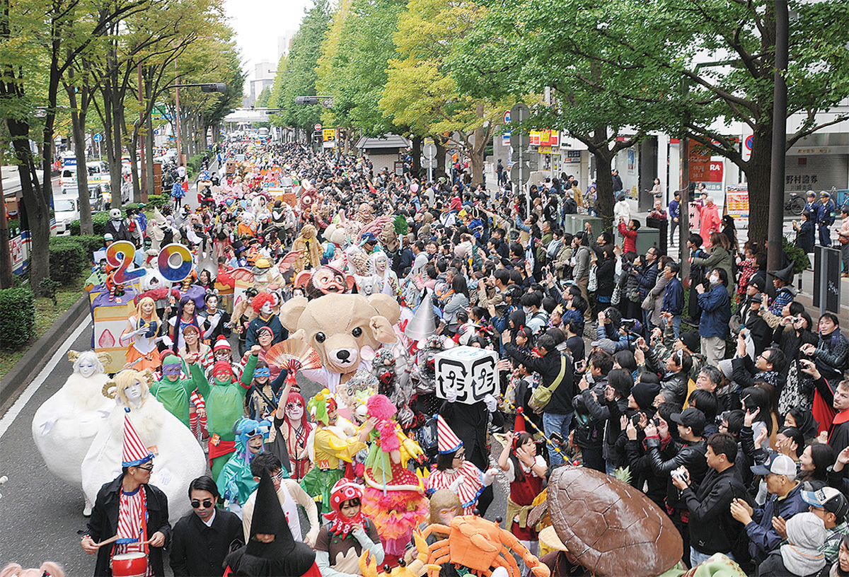 イベントを企画するチッタ エンタテイメント(川崎区小川町)によると、カワハロは「川崎の街の魅力と活力を発信しよう」と97年にスタート。当初パレードの参加者は150人程度だったが、年々規模が拡大。今では地元商店街や商業施設とプロジェクトを立ち上げ、日本最大級のハロウィーンイベントを盛り上げる。今年のパレードは午後2時30分頃から川崎ルフロン近くの京急高架下通りをスタート。市役所通り、平和通り、新川通りの全長1・7Kmを約1時間かけて練り歩き、ダンスパフォーマンスなどを繰り広げる。新川通りでは観覧場所を設け観客が安心して見られるよう配慮。同社では例年と同規模の13万人の人出を見込む。