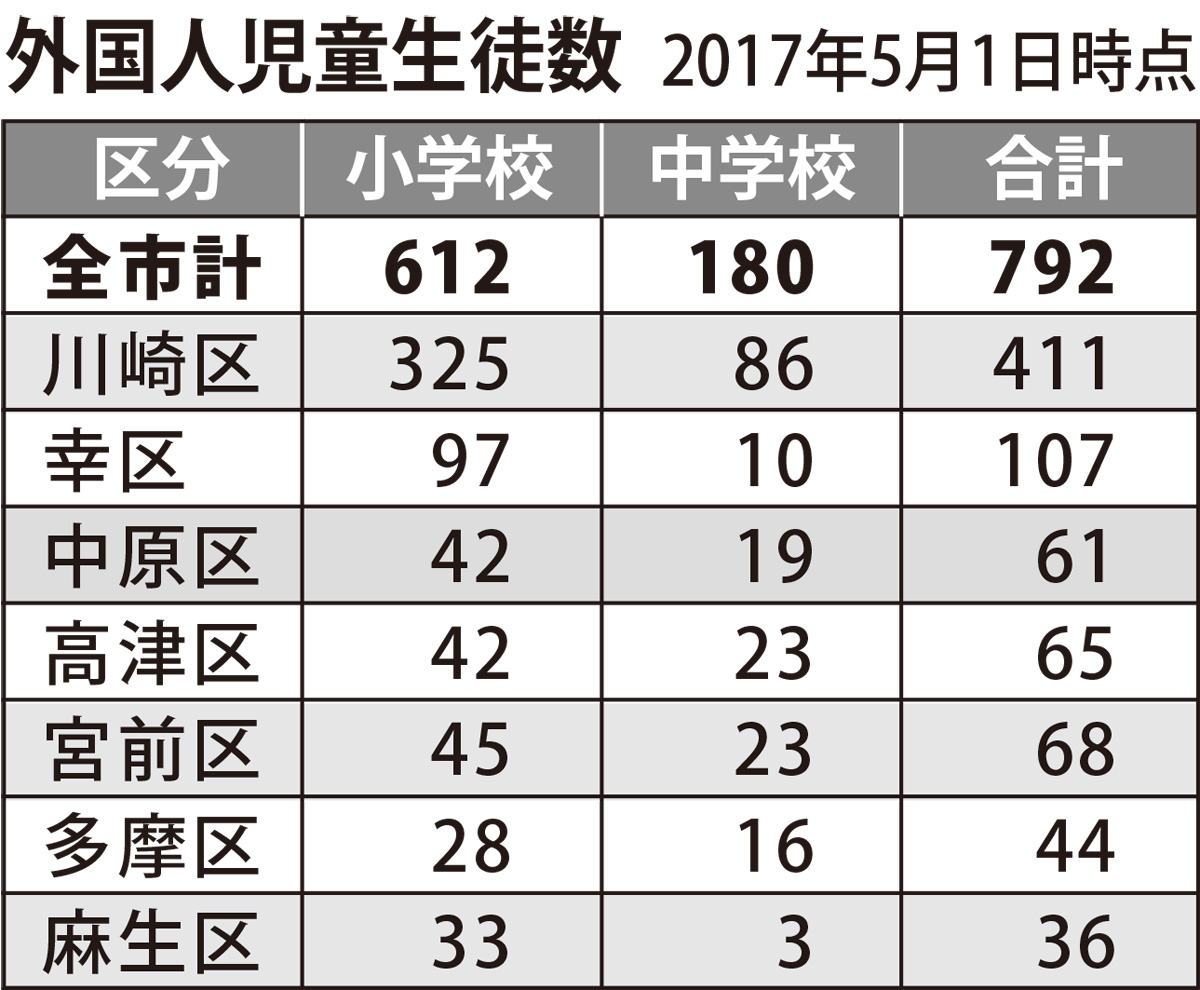 2017年の神奈川県の調査によると、川崎市内で日本語指導が必要な児童生徒は451人在籍する。