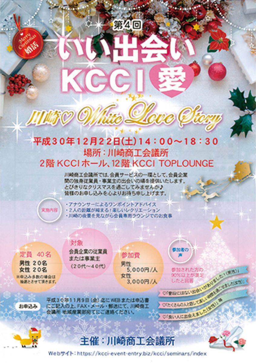 川崎商工会議所は会員企業の独身従業員、事業主を対象にした婚活パーティー「いい出会いKCCI愛」を12月22日(土)、川崎区駅前本町の川崎商工会議所で開く。