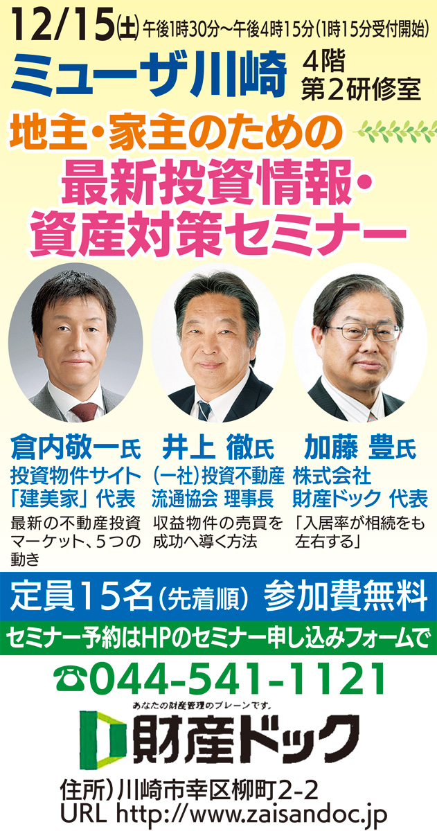 地元川崎で25年の実績、相続・土地活用問題・借地問題に精通した株式会社財産ドック(幸区柳町・加藤豊代表取締役)は12月15日(土)午後1時30分から4時15分、ミューザ川崎4階第2研修室で地主・家主のための資産対策セミナーを開催する。定員は先着15人。参加費無料。