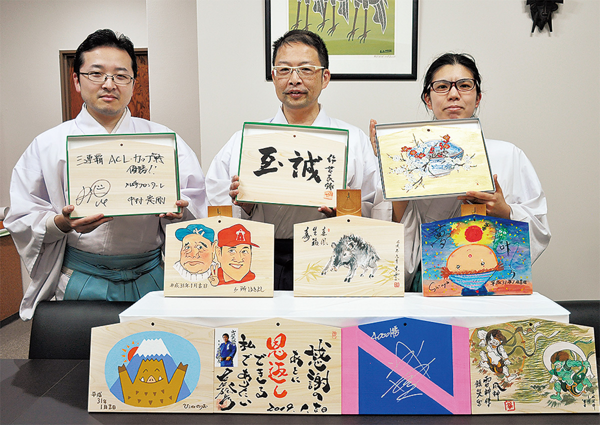 稲毛神社(川崎区宮本町・市川緋佐麿宮司)で開催される新春恒例行事「有名人慈善絵馬展」(元日から7日まで)に向け、同神社には、各界で活躍する著名人直筆の絵馬が続々と寄せられている。今年の話題をモチーフにした作品をはじめ、個性豊かな見ごたえある作品が見られる。