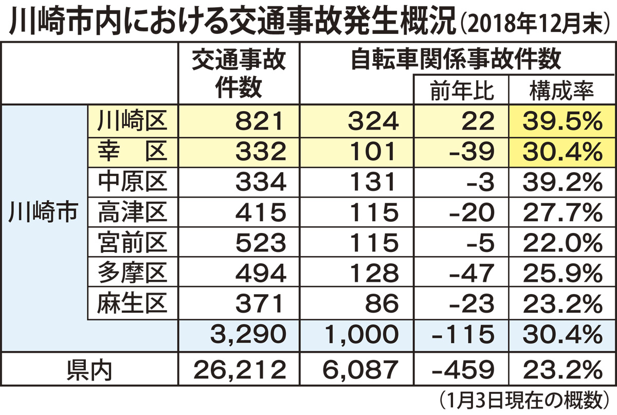 2018年の川崎市内の交通事故発生件数は3290件だった。そのうち自転車関係の事故は1000件で30・4%を占める。市はルール違反者にマナーアップ指導を行うなど事故防止対策に取り組む。