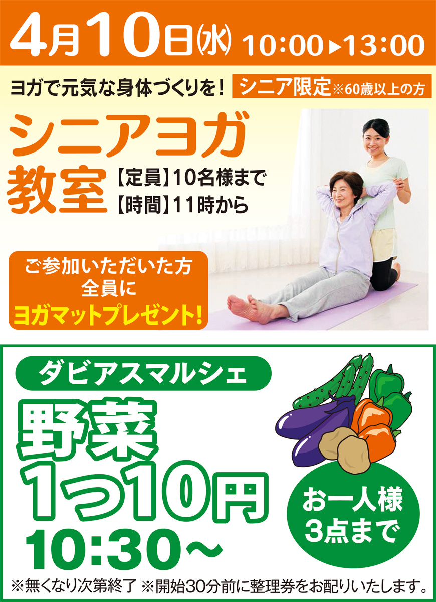 60歳以上のシニア対象で参加費は無料。「同年代の方が集まるので、周りを気にせず、のびのびとできます」と、同社は参加を呼び掛ける。参加者には「ヨガマット」プレゼントの特典も。開催時間は午前11時から。定員は申し込み先着10人。