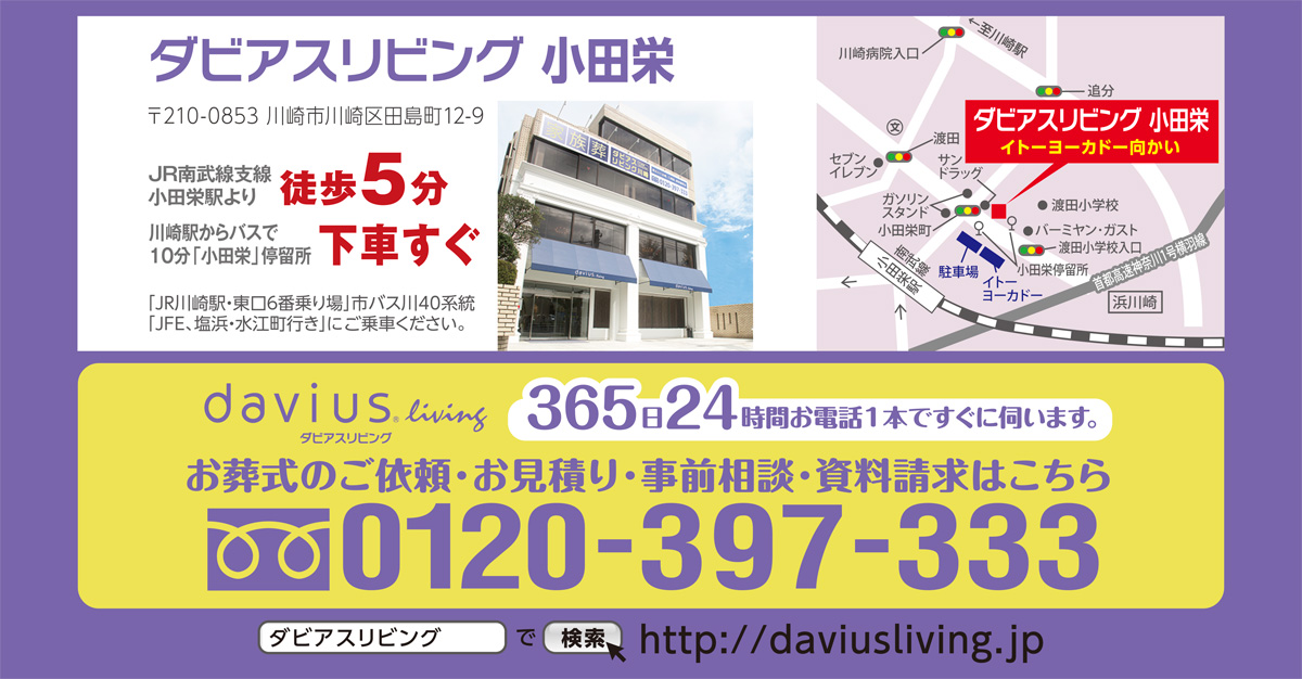 シンプルな葬儀プランで川崎と横浜など13カ所の家族葬専用式場を展開する「(株)神奈川こすもす」が4月10日(水)、イトーヨーカドー川崎店向かいの「ダビアスリビング小田栄」で恒例の地域イベントを開く。午前10時から午後1時。
