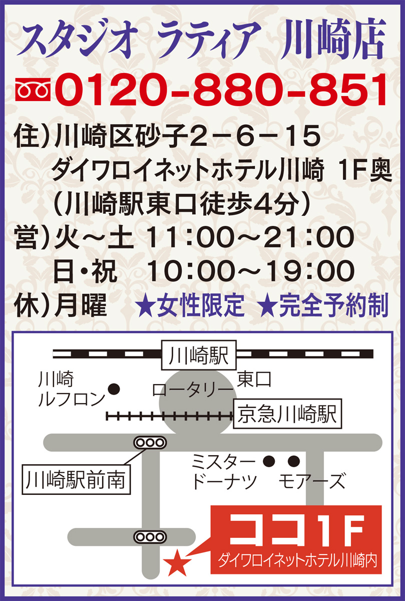 昨年、川崎駅前ダイワロイネットホテル1Fにオープンしたエステティックサロン「スタジオ ラティア 川崎店」。姉妹店のアヤ綱島店で”奇跡のフェイシャルエステ”として大人気の『光フェイシャル』が先月デビューし、大人気に!