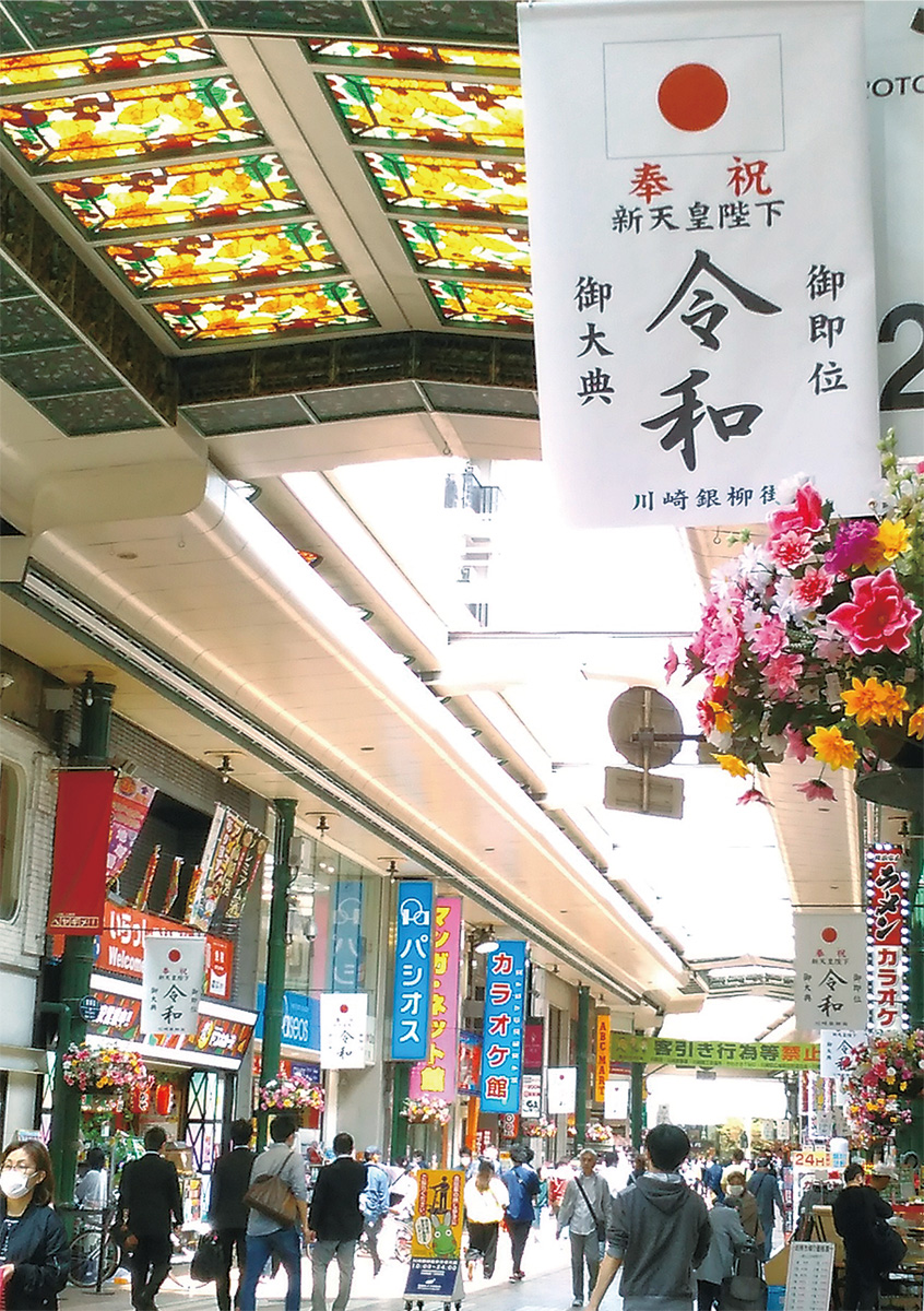 川崎銀柳街商業協同組合(小島照彦理事長)は元号が平成から令和に変わったことを記念し、商店街アーケードのフラッグを「令和」の文字をあしらったものに変更し、お祝いムードを演出している。