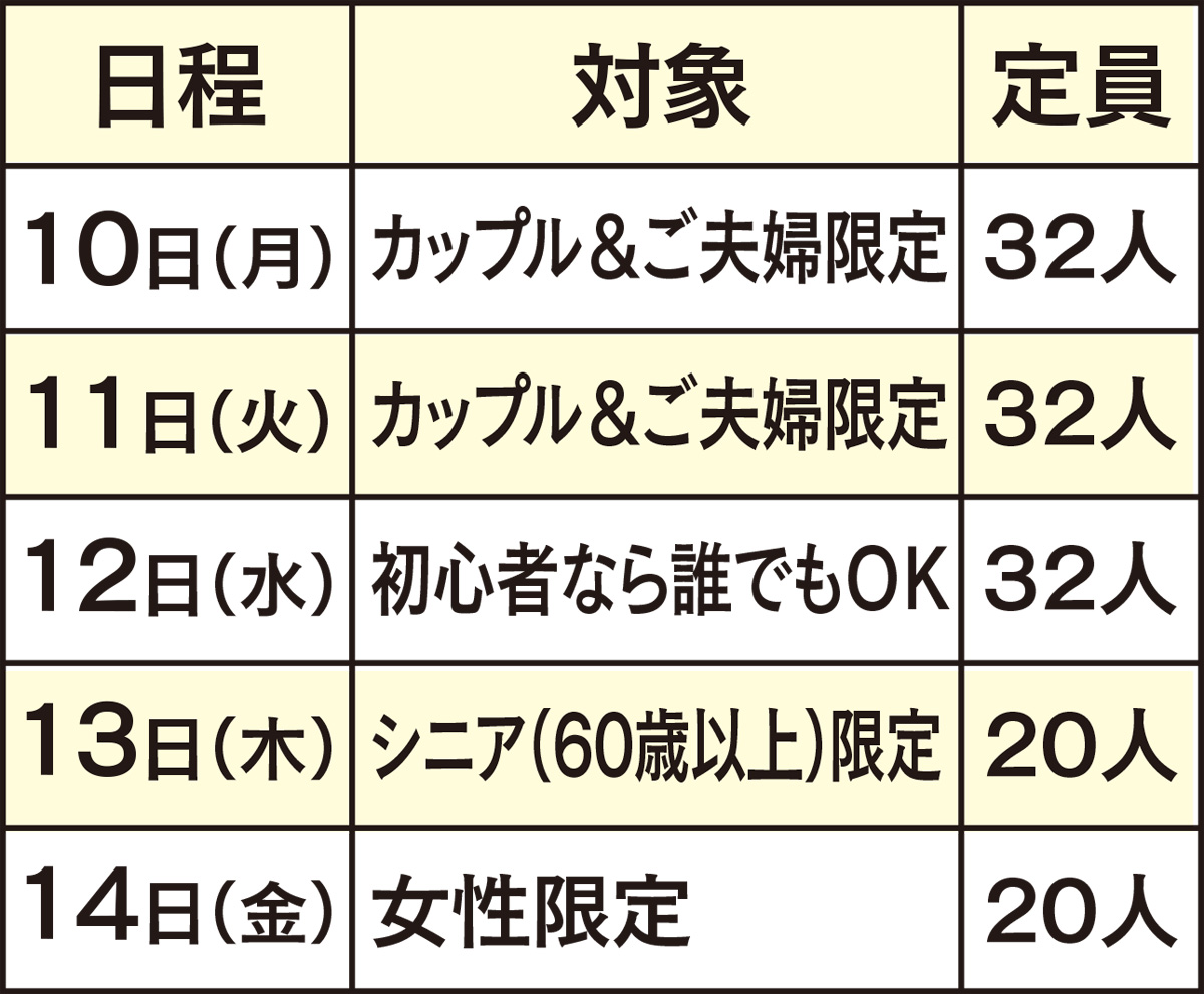 各教室の日程は表の通り。時間は午後4時30分から9時。