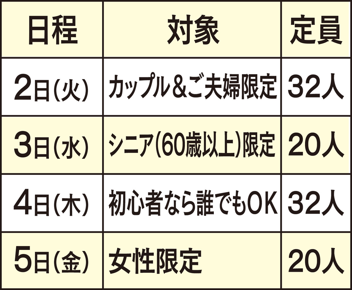 各教室の日程は表の通り。時間は午後4時30分から9時。