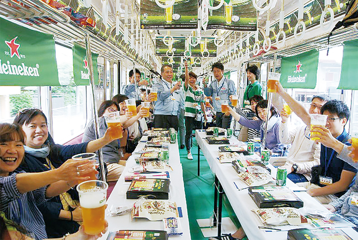 飲み放題は嬉しいし、車内で飲むのはいい気分。ホームでの生演奏やクイズも楽しい。もっと回数を増やしてほしい」とビール片手に語った。