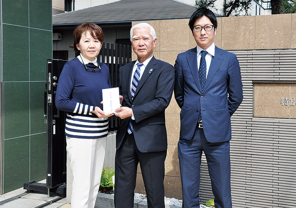 地域福祉の向上に役立ててもらおうと、(株)石川商事(本店・川崎区東門前)はこのほど、特別養護老人ホーム「ゆとりあ」(川崎区殿町)に現金40万円を寄付した。石川弘行代表取締役と石川純一郎取締役が同施設を訪れ、寺尾富美代理事長に手渡した。