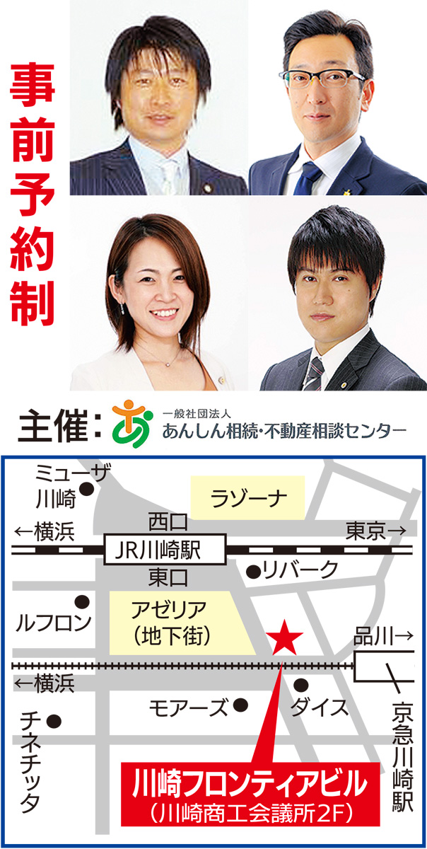 弁護士、司法書士、税理士、宅建士、FPなどの専門家が集い、相続や不動産に関する悩みに個別で応じる「無料相談会」が8月8日(木)、川崎フロンティアビル2階(会議室2)で開かれる。一般社団法人「あんしん相続・不動産相談センター」の主催。親族間のトラブル回避や相続税対策、不動産の困りごと、生命保険の見直しなど、各分野の専門家が最適な解決策を示してくれる。時間は午前9時から午後5時。事前予約制で相談は各人50分。申し込みは【フリーダイヤル】0120・123・988