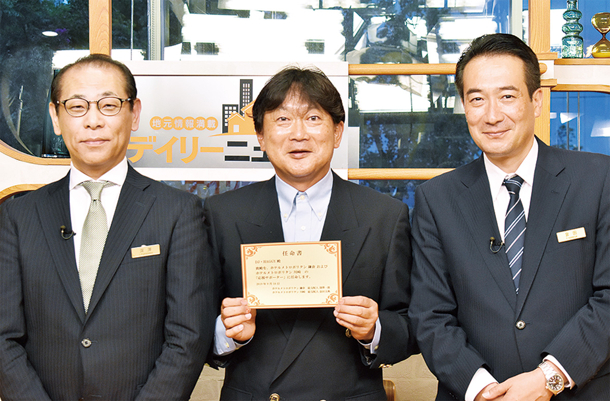 18日にはハギーさんがMCを務めるケーブルテレビの番組で任命式を実施。金田文典、深澤一郎両支配人から任命書を手渡されたハギーさんは、「県内を始め、県外から川崎や鎌倉へ来る人にも知ってもらえるようPRしたい」と話した。