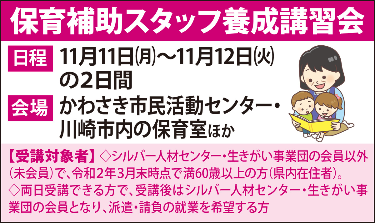 神奈川県シルバー人材センター連合会では、川崎市民などを対象に、高齢者活躍人材確保育成事業「保育補助スタッフ養成講習会」を開催する(定員30人)。
