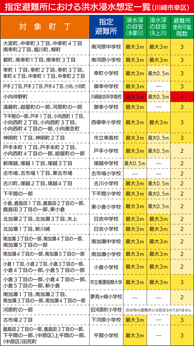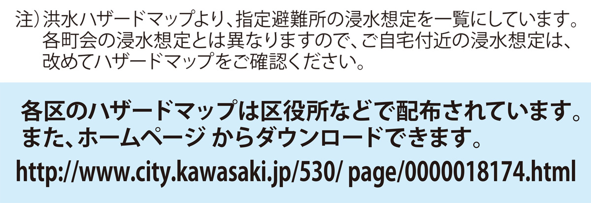 ぜひ、今一度、川崎市洪水ハザードマップでご自宅付近の浸水想定をご確認下さい。今回、市内156カ所の指定避難所への避難者が約3万人にも上りました。指定避難所をご確認頂くと共に、ご家庭での備蓄も再確認頂き、改めて災害への備えにお役立て下さい。