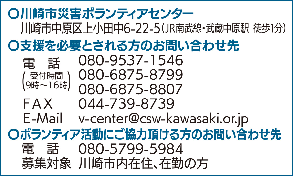 また、川崎市災害ボランティアセンターを15日より開設しています。同センターはJR南武線・武蔵中原駅前にあります「川崎市総合福祉センター(エポックなかはら)」の5階に設置され、復旧作業等にボランティアの派遣が必要とされる方からの相談を受け付けるとともに、ボランティア活動にご協力いただける方の受付を行っています。表に記載の連絡先までお問い合わせの程よろしくお願い申し上げます。