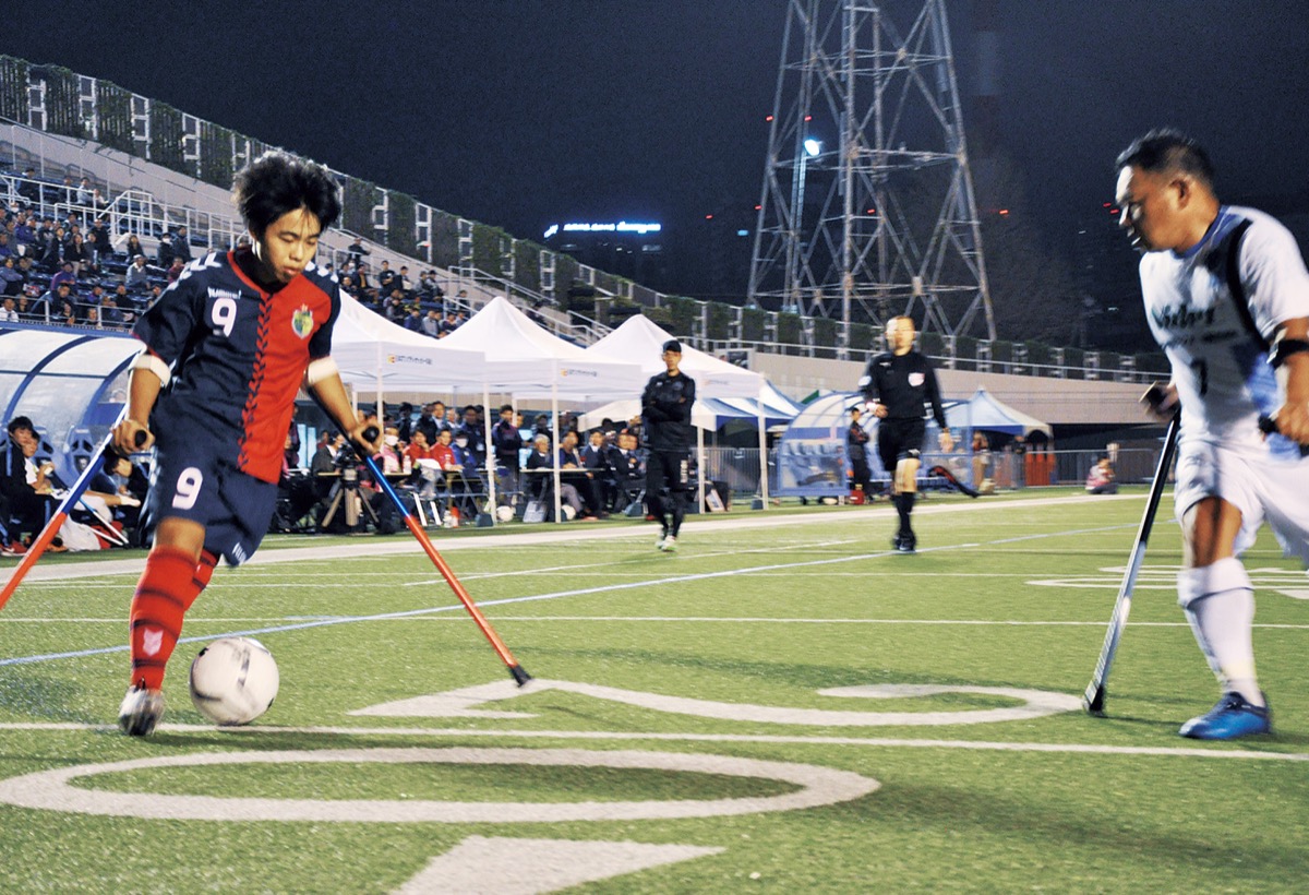 アンプティサッカーは、事故などで腕や脚を切断した人たちがクラッチと呼ばれる杖を使ってプレーする7人制の競技。同協会によると、世界30カ国以上が世界連盟に加盟し、日本では9チームが活動しているという。川崎フロンターレの前社長である武田信平さんが現在、同協会の理事長を務める。