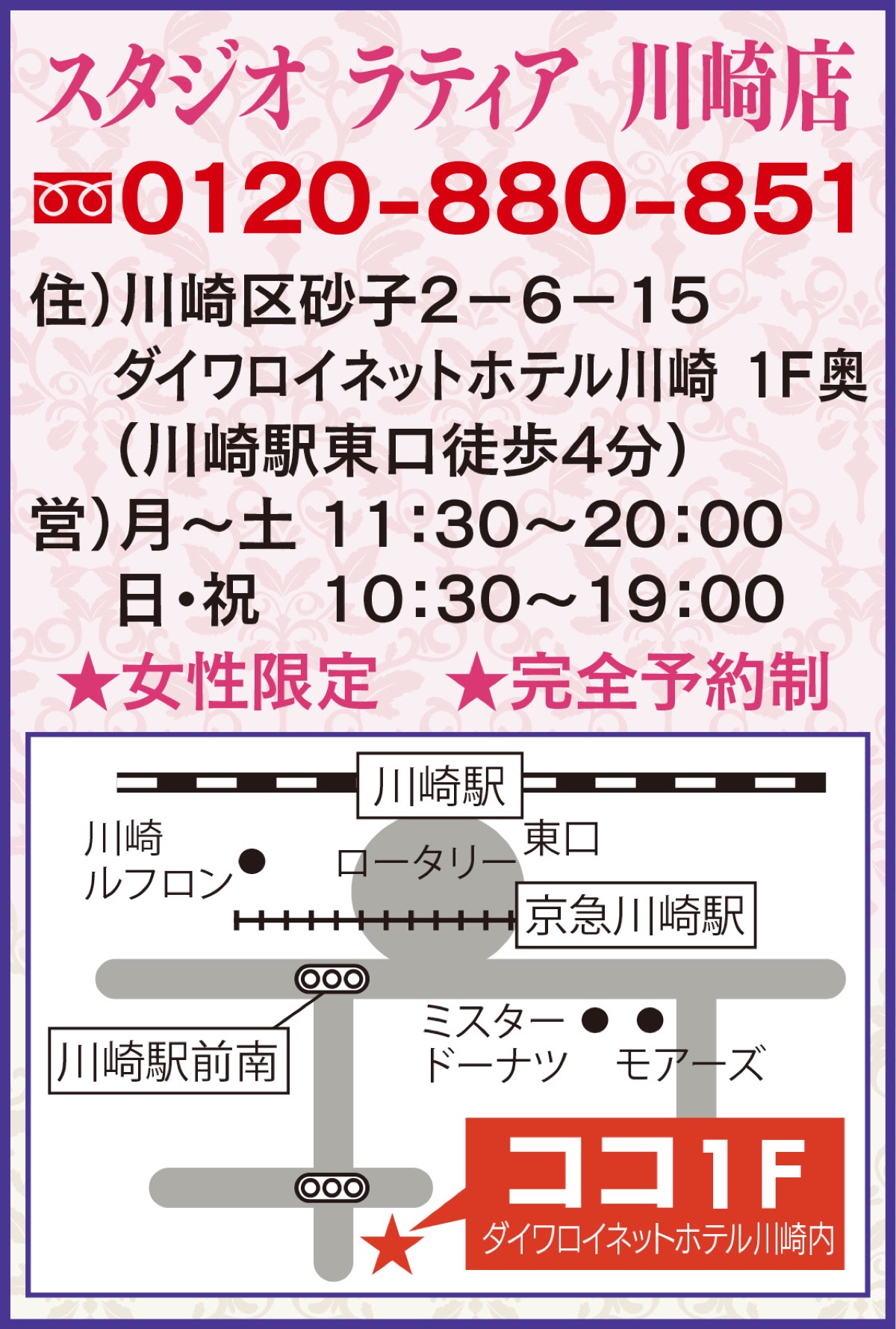 川崎駅から4分、エステティックサロン「スタジオラティア川崎店」では、季節の変わり目の肌ケアに『バイオピーリング(美容液導入・EMS付き)』が人気急上昇中。肌に優しい天然由来の特殊な美容液で古い角質を洗い流すことで、生まれたての肌に。「ザラつく肌、開いた毛穴でお悩みの方は、思い切って一度体験を。期待を裏切らないはず」と同店スタッフ。回数を重ねればシミにも有効。EMSでは表情筋に働きかけ、顔全体のたるみを改善。この3つの施術が同時に受けられるのは同サロンだけ!予約は4月30日迄。※初回限定。継続しやすい特典も。綱島・横浜店での体験利用者は不可。