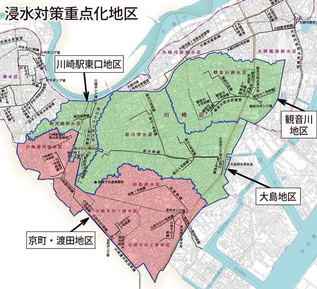 浸水対策は、近年の局地的豪雨による水害の深刻化を受けて市が取り組んでいるものです。2017年度に公表した中期計画では浸水対策重点地区を指定。川崎区では「京町・渡田地区」「川崎駅東口周辺地区」「大島地区」「観音川地区」の4地区が重点化地区となりました。