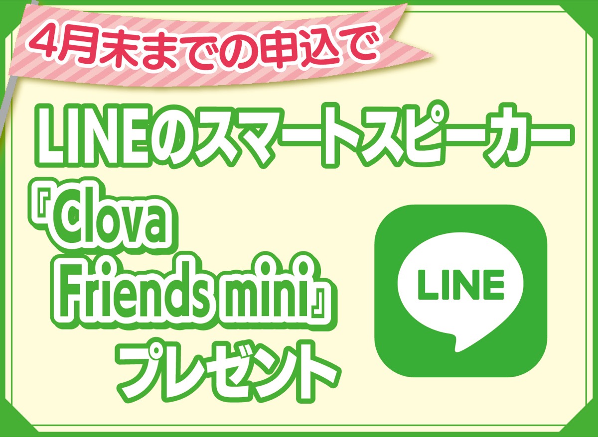 今なら4月中の申込に限り、家電操作などにも使用できるLINEのスマートスピーカーを一台プレゼント。問合せ・申込はお早めに。