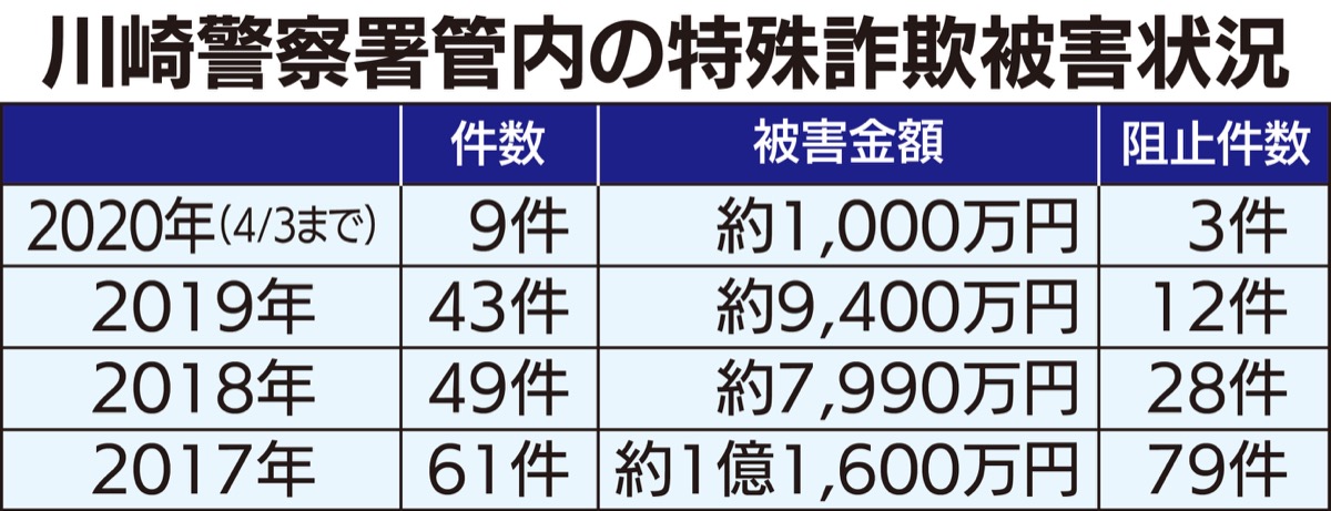 川崎警察署管内で発生する振り込め詐欺などの特殊詐欺の被害がなくならない。2019年は被害件数43件、被害額約9400万円。一方で、水際で振り込め詐欺が防がれたケースもある。本紙では昨年被害を未然に防いだファミリーマートなわてや八丁畷店店長の明立篤さん、川崎信用金庫大師支店の安部啓子さんと清水昭人署長に話を聞いた。