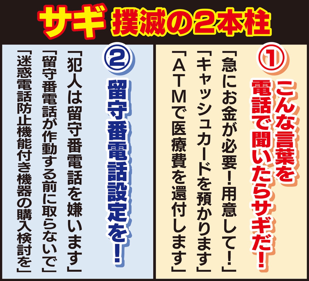 振り込め詐欺の多くは家の固定電話にかかってくる。迷惑電話防止機能付機器は呼び出し音を鳴らす前に、「この通話内容を録音します」という旨の警告と自動録音をすることで、録音を嫌う犯人が電話を切り、騙される可能性が減る。川崎警察署では機器の貸し出しも行っているので不安な人は相談を。新型コロナウイルス感染拡大に便乗した詐欺にもご注意を。