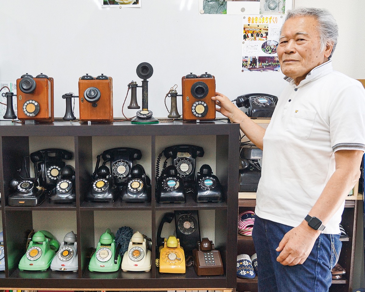 大野さんの電話機収集は42歳の時に技術職から営業職に変わったのを機にストップ。自宅倉庫の奥にしまい込み、実はつい最近までその存在すら忘れていた。コロナ禍で自宅の整理をする中、倉庫の奥から電話機を発見。懐かしく思い、何気なくはきもの店のショーケースに下駄や雪駄と並べて置いていたところ、興味を持つお客さんがいた。それならばいっそきちんと見てもらおうと隣のパソコン教室に棚を作り、ディスプレイした。