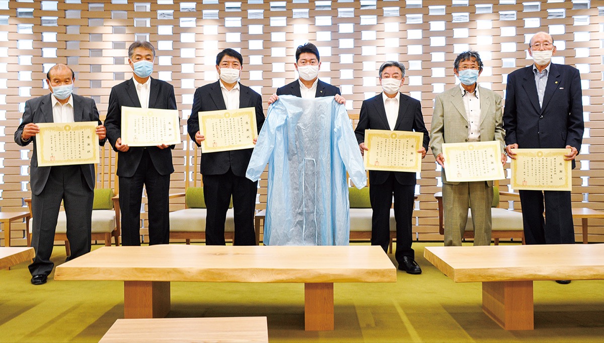 新型コロナウイルスの感染拡大防止に役立ててもらおうと、川崎市浅野町工業団地の有志企業が7月2日、医療用ガウン3700着を市に寄贈した。福田紀彦市長から返礼として感謝状が各企業に手渡された。
