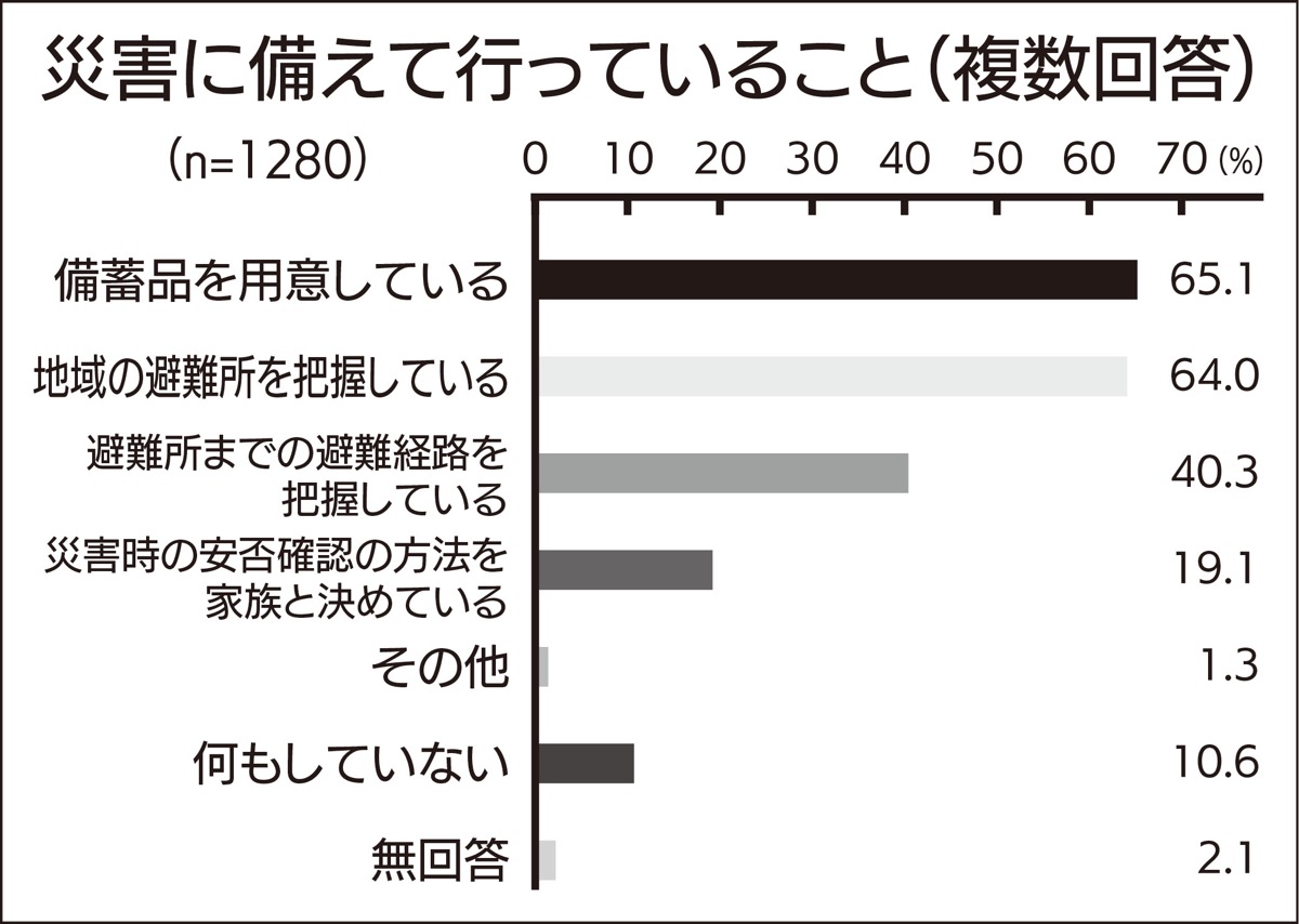 「防災」については災害時の備えについての質問で「備蓄品を用意している」(65・1%)が昨年から4・3ポイント増加、「避難所までの避難経路を把握している」(40・3%)が2・9ポイント増加など、昨年の台風の影響からか意識の高まりがみられた。