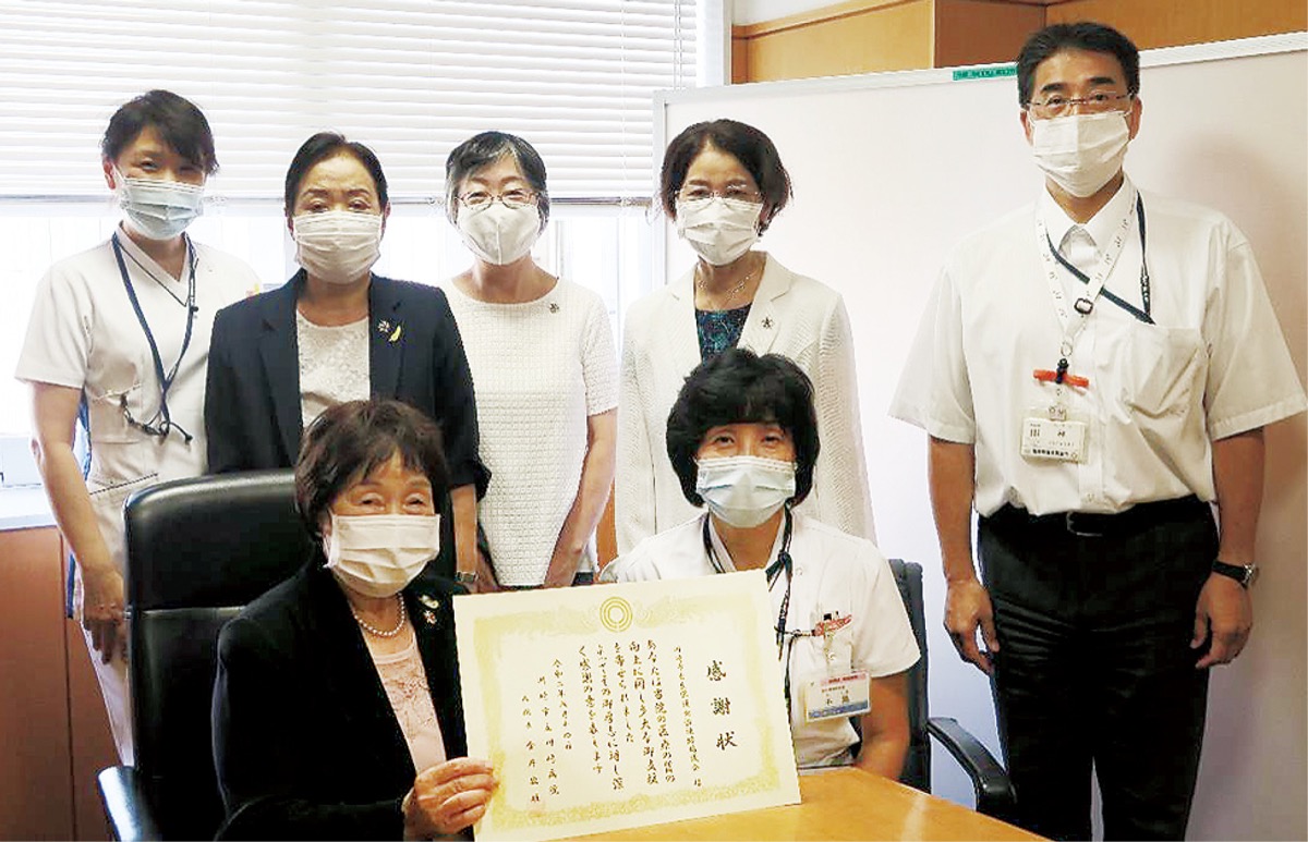 梅津会長、會田淳子副会長、松世三重子副会長、岩瀬絹代理事が同病院を訪問。千島美奈子副病院長、原田直子副看護部長、林徳厚事務局長にパーテーションを贈呈した。同病院によると、パーテーションは正面玄関横の患者案内前、ER診療室、各外来の診療室や処置室などで現在使用しているという。