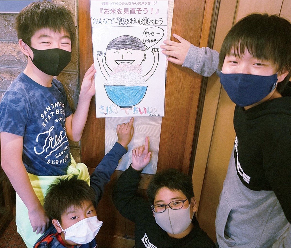 田中悠空(はるく)さんは「たくさんの人にお米を食べてもらいたいと思った」、藤田浩輝(こうき)さんは「お米を残す人がいて残念、ポスターでみんなにお米のことを知らせたい」、米倉龍之介さんは「地域の人にお米がピンチなことを知ってもらいたかった」、山崎鷲斗(しゅうと)さんは「お米は何にでもあっておいしい。日本人なのにお米を食べないのは悲しい」とそれぞれ思いを語った。