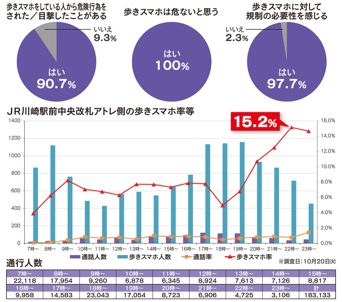 夜遅くの時間帯には一番多い地点で15・2%の歩きスマホが確認されました。これは「歩きスマホの防止に関する条例」が施行されました大和市の大和駅前調査結果である13%を上回る数値です。約25メートルという狭い空間で1時間に多くの人が行き交う駅前において、この数値は非常に危険と言えます。