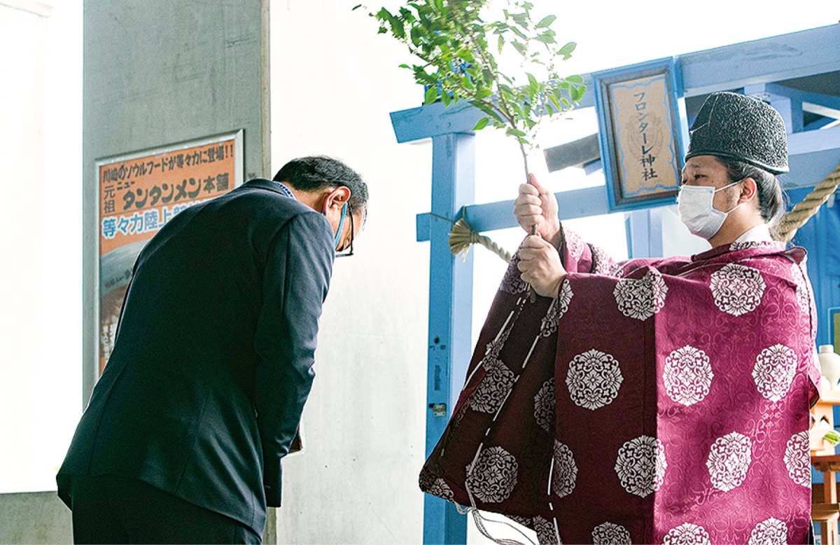 サッカーJ1・川崎フロンターレは2月26日、リーグ開幕戦の会場となった等々力陸上競技場に開設された「フロンターレ神社」で、今シーズンの試合運営の安全と同クラブの勝利を祈る祈祷が行われた。藁科義弘代表取締役社長をはじめクラブスタッフが参列。若宮八幡宮(川崎区大師駅前)の中村博行宮司が祝詞を詠みあげた。