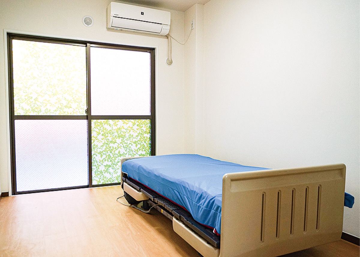 同ホームはこの度、リフォームを行いバリアフリーに。居室は6畳の洋室。介護ベッドとエアコン付き。