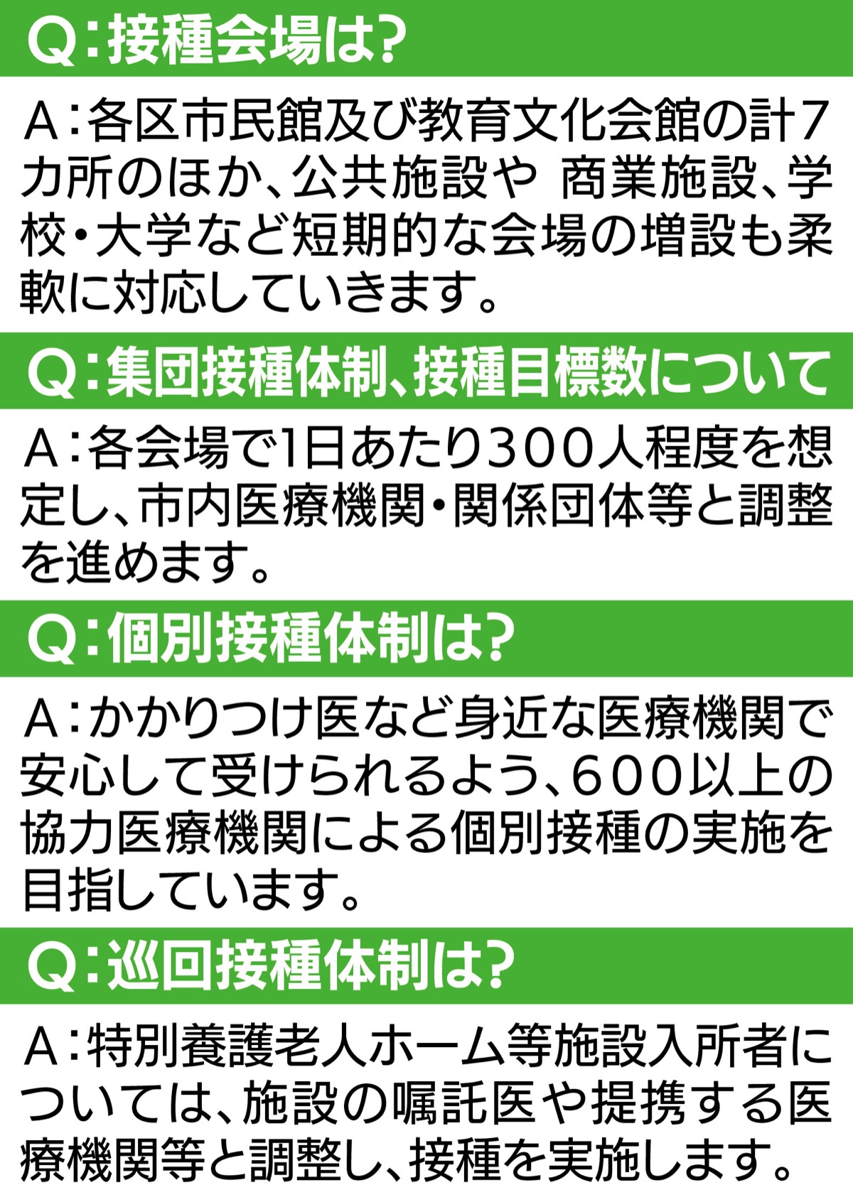 A:ワクチンは、確保できる量に限りがあり供給も順次行われる見通しのことから、高齢者分の接種券については、スムーズな接種体制とするため、「75歳以上」と「65歳以上」の2段階に分けて発送することを前提に準備を進めています。