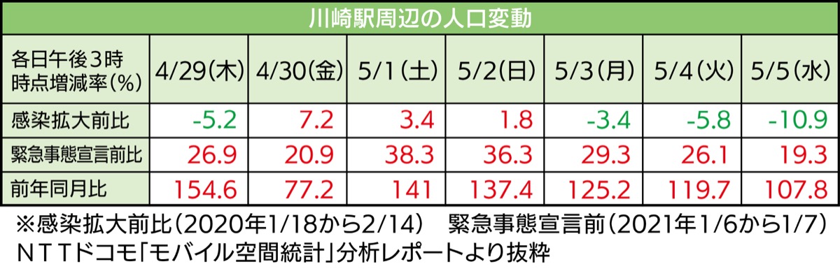 調査対象エリアはJR川崎駅を中心とした500m四方で、各日午後3時時点での増減率。