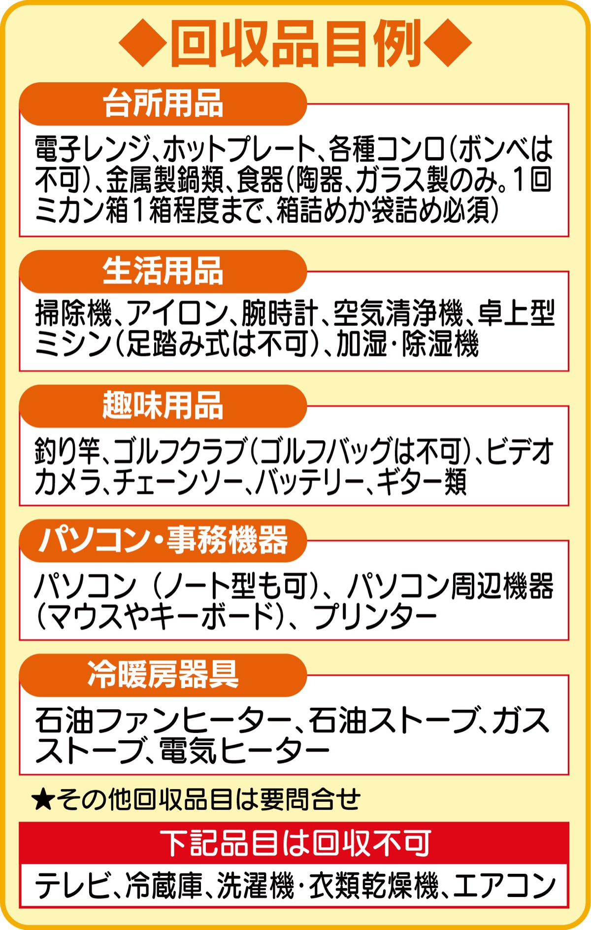 使わなくなった食器(陶器、ガラス製のみ)や、ホットプレートなどの台所用品をはじめ、パソコンや石油ファンヒーターなどの家電、ゴルフクラブや釣り竿なども回収してくれる=表参照。回収は1人2品目まで。