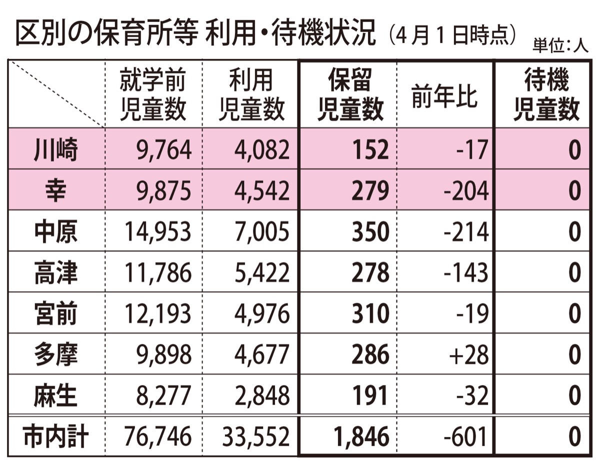 一方、川崎区は待機児童数が1人から0人、保留児童数は169人から152人となった。