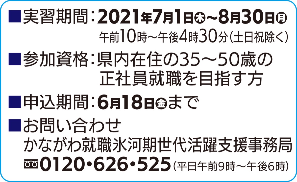 その流れを受けて今年度は、就職氷河期世代の方々を対象として、正社員としての基本的なスキルや心構え等を習得するための2か月間の職務実習型プログラム「かながわジョブテラス」が新たに開講されます。受講者には1日あたり3000円の就活支援金が支給され(要件あり)、修了後も就職活動や職場定着を継続して支援します。
