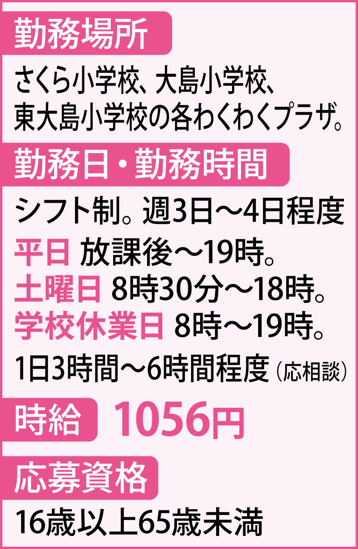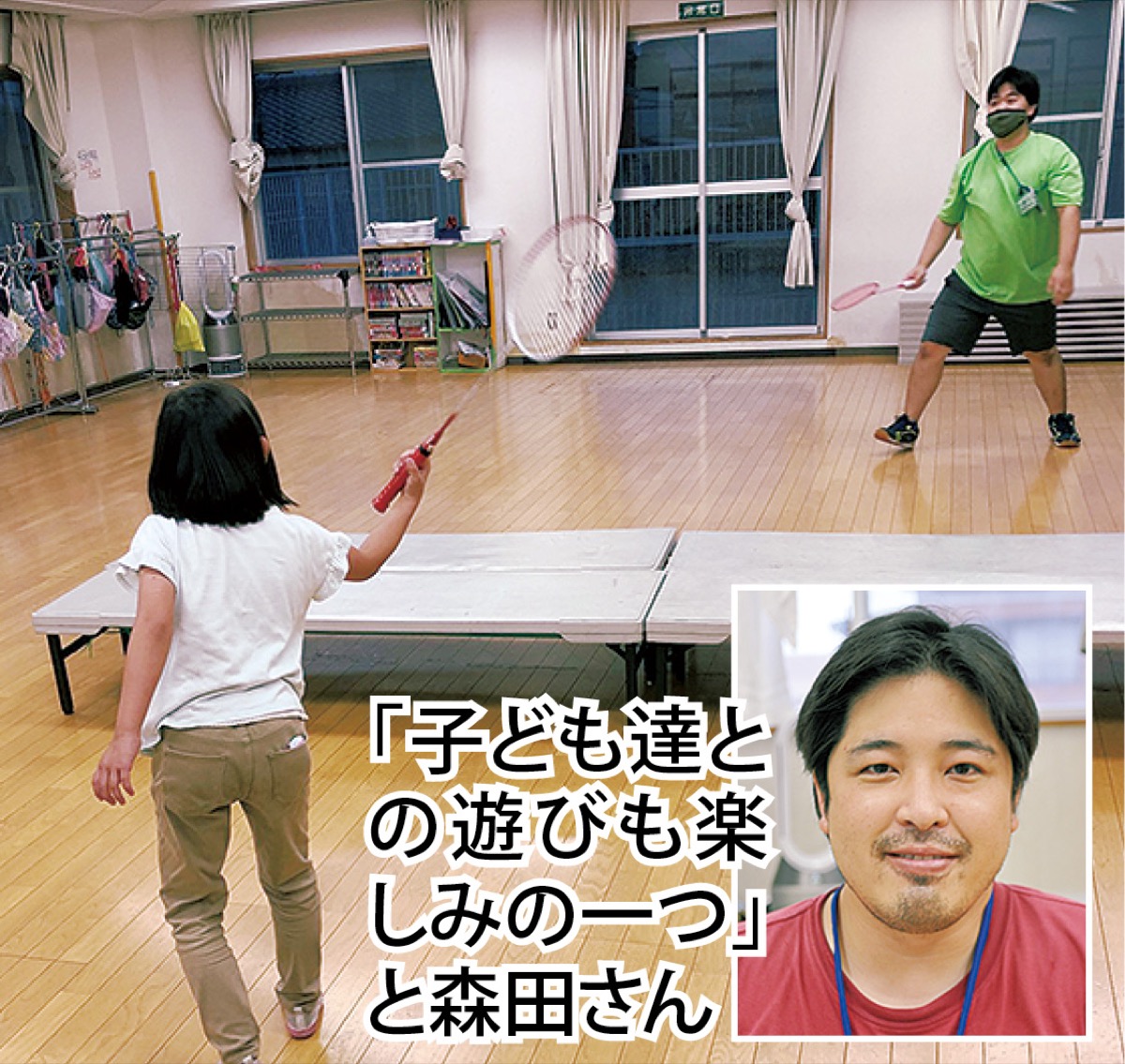 放課後の学校施設で、小学生の子どもたちの安全に気を配りながら一緒に絵を描いたり、ボール遊びで楽しく過ごす「わくわくプラザ」のスタッフ。さくら小などで働く森田和幸さん(35)は日々、「子どもたちから力をもらっています」と笑顔で語る。1年生の時には、ケンカばかりしていた子がやがて、低学年の子たちの面倒を見始めるなど「子どもたちの成長を感じるのがやりがい」という。また、障がいのある子も交じって一緒に過ごし、「様々な発見があり面白い」とも。