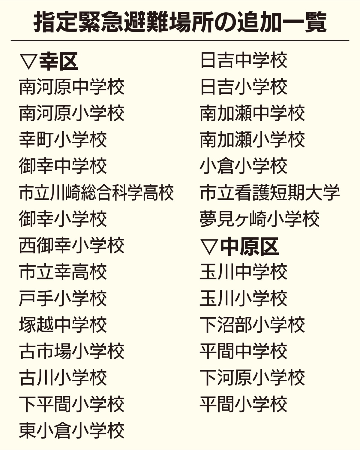 川崎市は今月8日、東京湾で高潮が発生した場合、中原区と幸区の一部で浸水する可能性があるとして、新たに緊急避難場所を27カ所指定した。これまで設けられていたのは川崎区の一部のみ。水防法の改正を受け、神奈川県が2019年に作成した「高潮浸水想定区域」から一定の耐久度を有する市立学校が選ばれた。