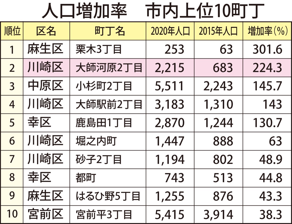 増加率の市内上位10町丁には川崎区から4町丁、幸区から2町丁が入っている。川崎区「大師駅前2丁目」(143%)が4位、幸区「鹿島田1丁目」(130・7%)が5位、川崎区「堀之内町」(63%)が6位、続いて「砂子2丁目」(48%・9)が7位、幸区「都町」(44・8%)が8位となった。