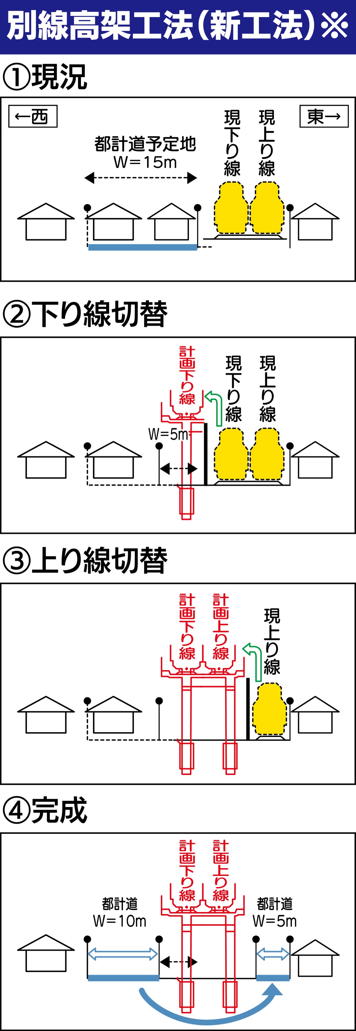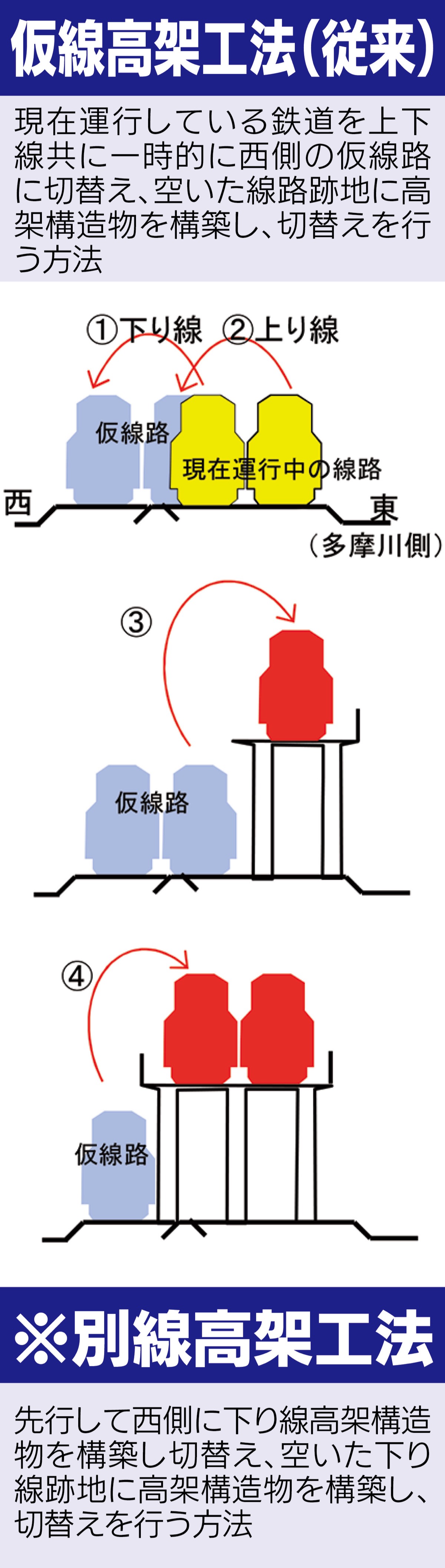 従来の仮線高架工法より今回検討している別線高架工法は、事業費の縮減と全体工期の短縮が果たされ、開かずの踏切が早く解消できます。鹿島田駅のペデストリアンデッキが支障となりますが現在対応を検討し、鉄道が高架化され地上での往来が可能となります。