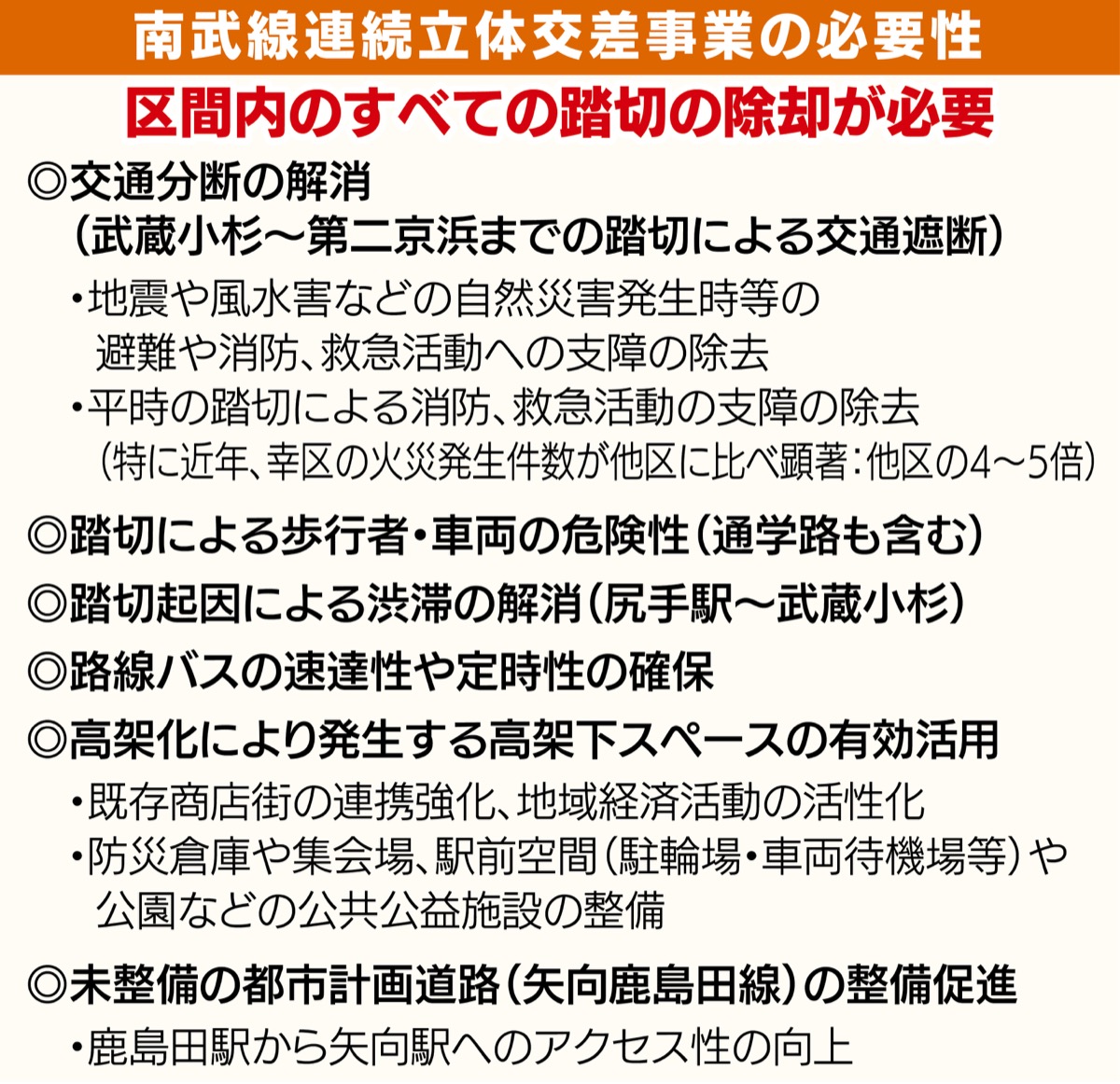 私自身、今年に入り南武線沿線地域の方々からお聞きした高架化の早期実現への期待を市長に伝え、新たな工法の成果が示された後、個々の踏切の暫定対策ではなく、連続立体交差事業の早期実現を目指すよう強く要望しました。