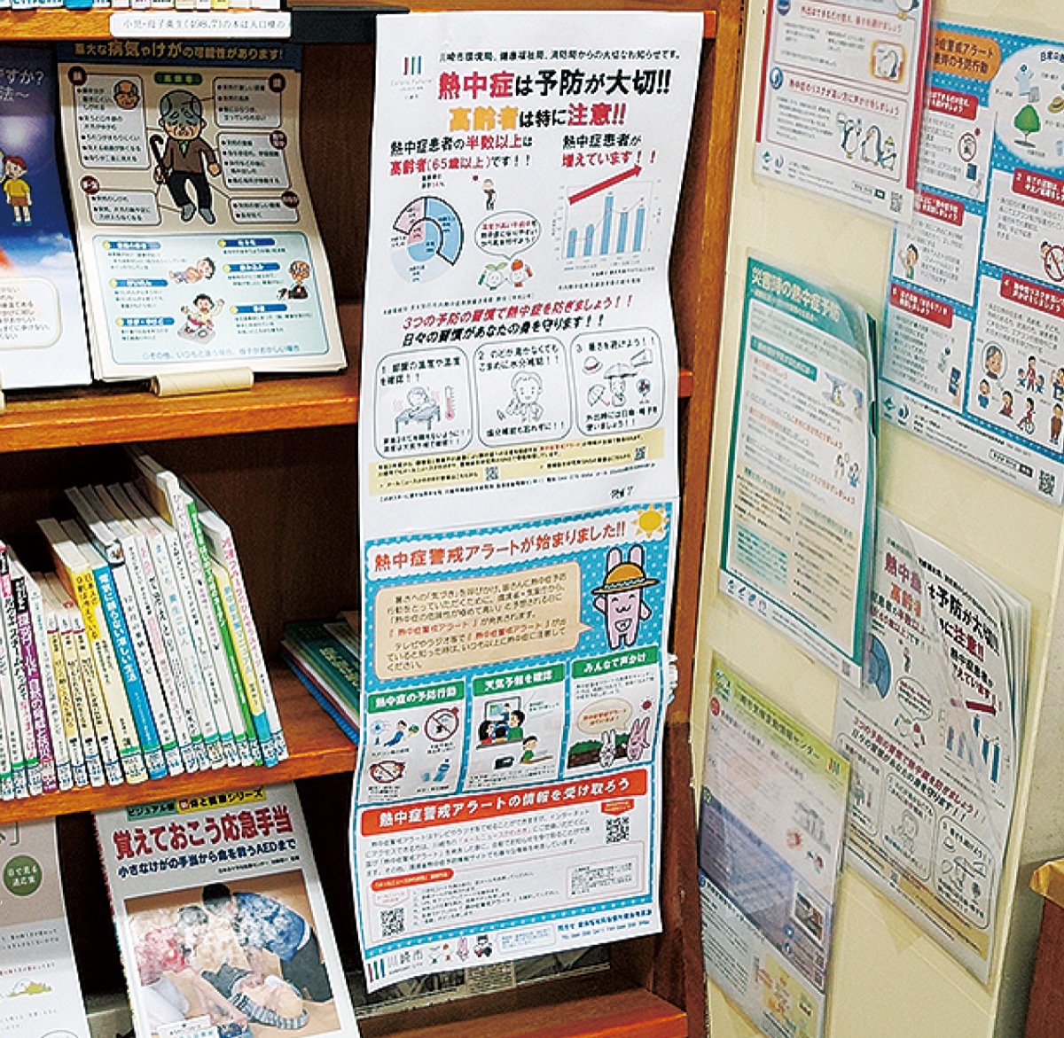 市は今年度の熱中症予防啓発として、コロナワクチン集団接種会場でのチラシの配架や要請を受けた町内会でのチラシ回覧を実施。普通ごみ収集車の車体には啓発看板を掲出し、市立図書館7館では8月31日までポスターを掲示している。幸図書館では、カウンター脇の「薬学」の書棚の一角にポスターを掲示。環境省や市が発行する各種啓発チラシを設置し、来館者に熱中症予防を呼びかけている。