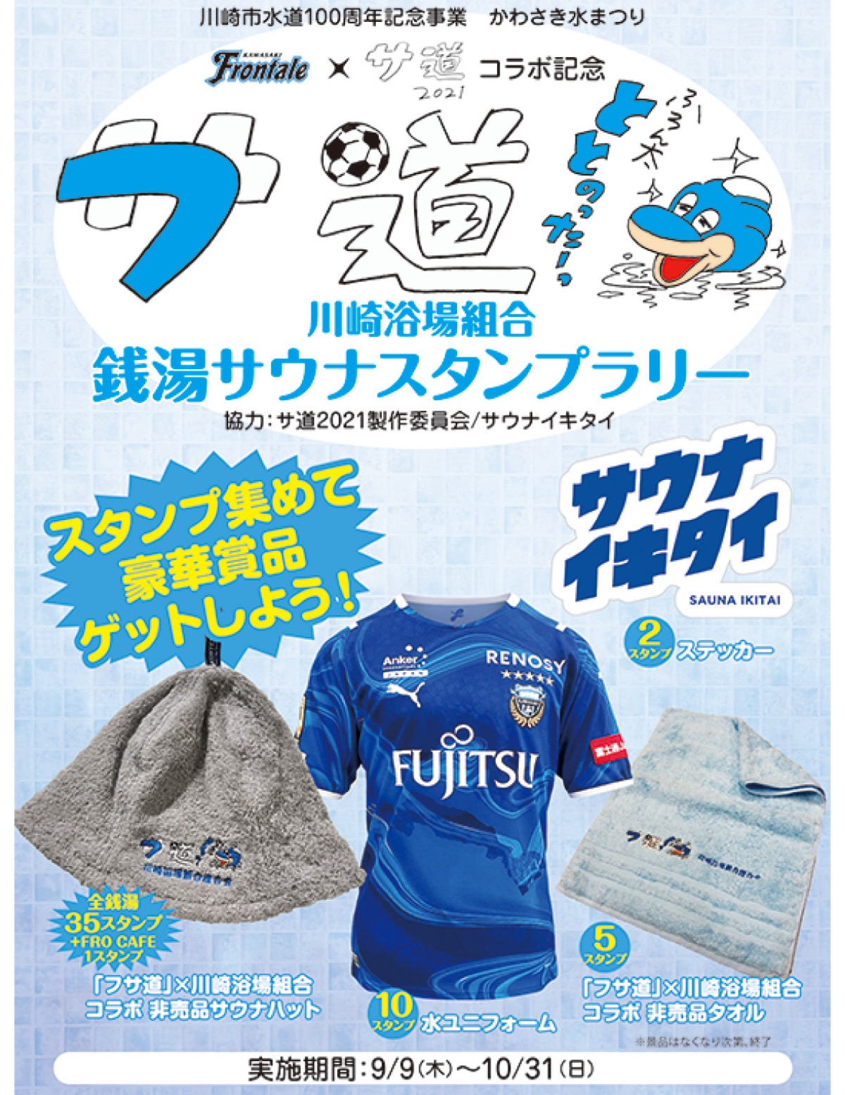 スタンプラリーは、同クラブとテレビ東京などで放送中の人気ドラマ「サ道2021」とのコラボ企画「フサ道」の一環。同クラブは9月9日(木)、等々力陸上競技場で行われるヴィッセル神戸戦(午後7時キックオフ)で川崎市上下水道局の給水100周年を記念したイベント「かわさき水まつり」を開催し、「フサ道ランド」と銘打った会場を開設する。試合当日の会場の川崎浴場組合ブースでもスタンプラリーの冊子を配布し、先着1000人にロッテの「クーリッシュ」を、リミテッドユニフォームがデザインされた専用カバーとともにプレゼントする。スタンプラリーを全店舗制覇すると、抽選でフサ道オリジナル非売品「サウナハット」がもらえる。同クラブスタッフは「川崎にも銭湯サウナの名店が数多く存在します。この機会に銭湯を巡って豪華賞品をゲットしよう」と呼びかける。