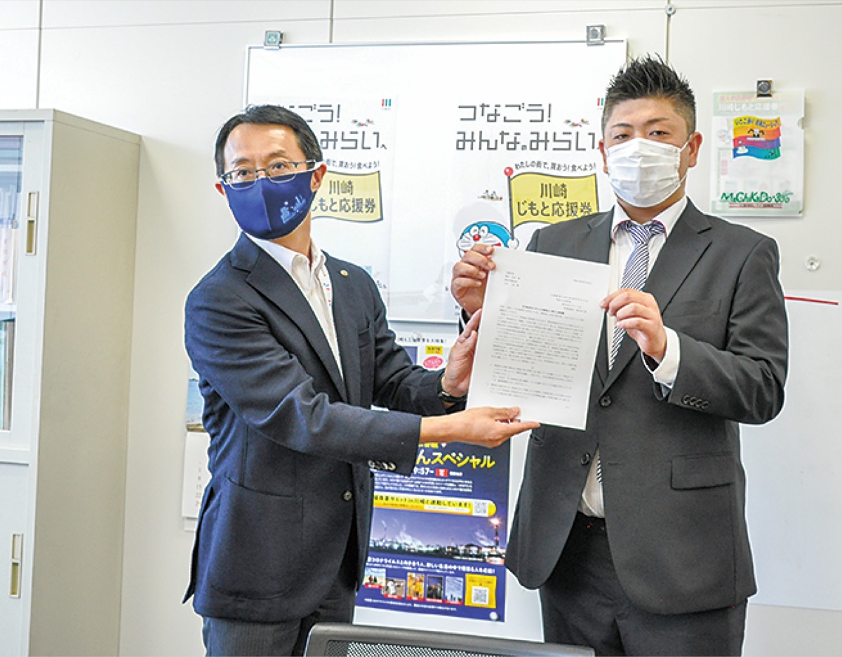 新型コロナ禍で営業の自粛など制限を強いられ、厳しい経営状況にある飲食店への支援強化を求めようと、「川崎駅東口周辺飲食店有志の会」は8月26日、川崎市に要望書を提出した。感染防止策を行う店舗に対し、市が独自にウェブサイトで紹介することや神奈川県が認証する「マスク飲食実施店」であることが一目でわかるようステッカーの作成と交付、新たなプレミアム商品券の発行の検討を求めた。
