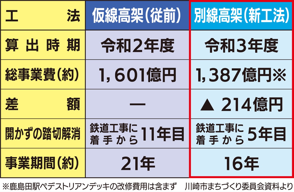 今回の新工法の検討では、従前工法での仮線工事が不要となり、開かずの踏切の解消までの期間は従前の工法から6年短縮、事業期間の短縮により、踏切の除却も早まり、交通分断の解消や危険性の排除等、事業の目的が早期に実現できるとしています。