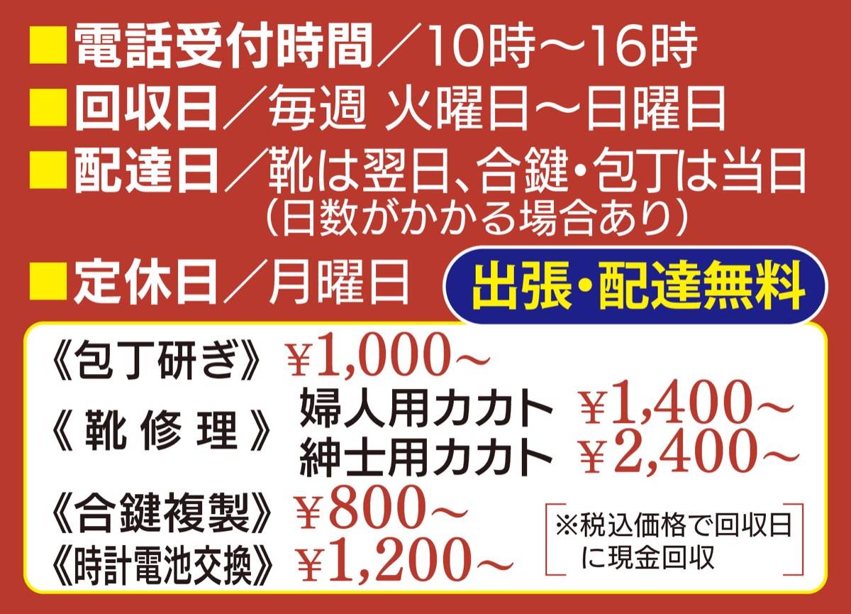 出張サービス(川崎区・幸区)は電話受付後、訪問して回収し、最短翌日までに自宅にお届け。店頭での修理もOK(要事前連絡)。